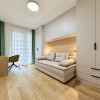 Pozitionat la etajul 7 al imobilului, apartamentul este compus din living-room open space cu bucataria, 2 dormitoare, hol, 2 bai si un balcon foarte generos, cu acces din fiecare camera.